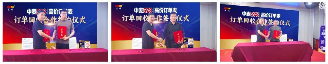 会议现场,天河宏业粮油、河北力麦粮油、柏乡新宏粮油等企业与新乐福瑞农资完成收购合作签约,以合同锁定回收渠道、以高价锁定农户收益,真正让农户种麦不愁销路、不愁卖价!